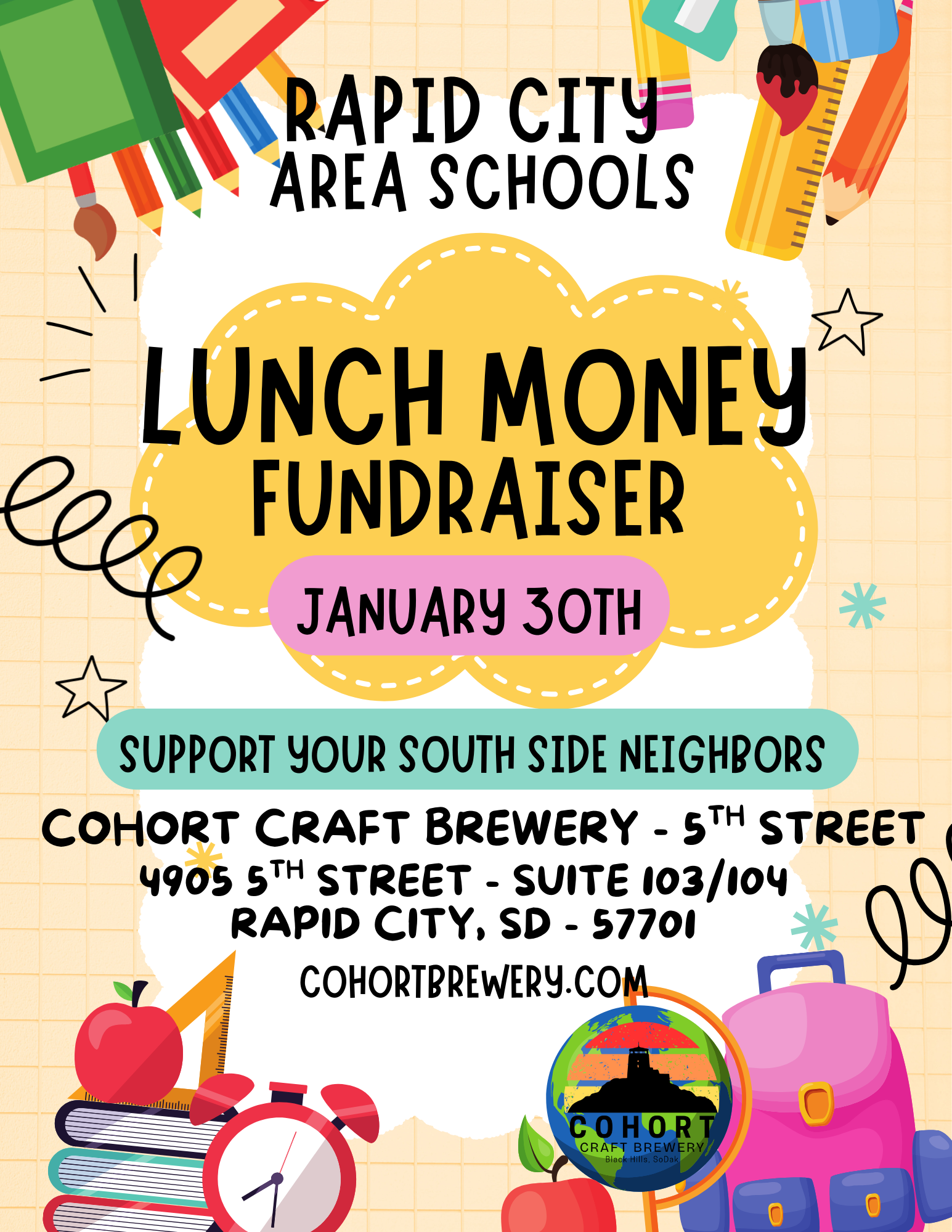 Help us support our South Side neighbors and your student’s friends and classmates. Some of our local families of the RCAS are having trouble keeping up with their student meal account balances resulting in possible referral to collection agencies. Not only does this further burden families that are already cash strapped, but also the self supporting RCAS Student Nutrition Department. RCAS serves every student a lunch every day, regardless of balance. It’s is our goal to raise funds via cash donation, GoFund Me, Black Hills Area Community Foundation, and 25% of TOTAL sales January 30th at the 5th Street taproom. Proceeds will help cover meal balances for families in need. This fundraiser is family friendly, several N/A options available.
